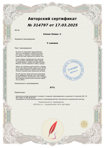 Ко мне не приходит вдохновение, Хотя и в печурке и теплится огонь. И я пишу у камина стихотворение, Какой же мне приснится нынче сон. А мы словно городские все жители, Не случайно попавшие сюда порой. А люди вокруг такие уже мыслители, Меня в гости позвали к себе у пруда. Здесь не слышен шум ночного города, А гул моторов совсем давно уже затих. Но я живу словно в тихом этом омуте, Только слушаю шум вьюжных ветров. И всё кругом такое всё уже красивое, И на деревьях белый снег уже зимой. И шум ночного сказочного того города, Не слышен совсем уже ночною порой. 24.12.2001г. Просмотров: 750